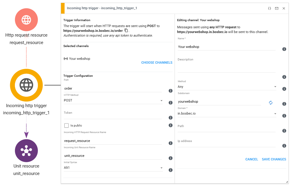 As you can see in the trigger information in the image, the trigger will start when HTTP requests are sent POST to https://yourwebshop.in.bosbec.io/order.