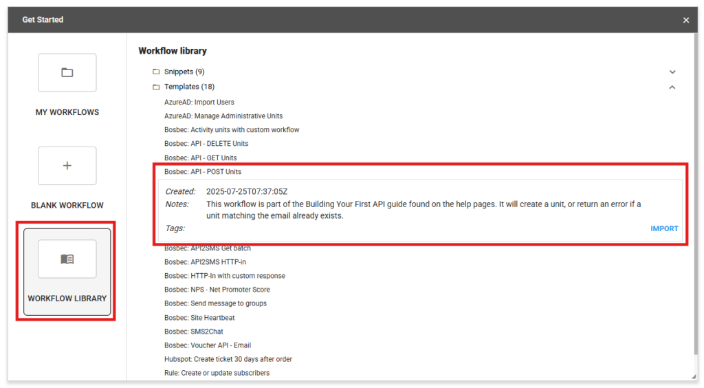 Goal: Create an API token, import a ready-made workflow, and send your first successful POST request.