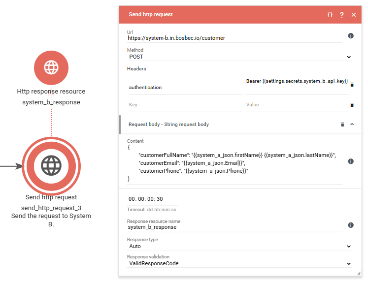 In the example below, you can see how a Send HTTP Request job is configured to perform a POST request to System B.