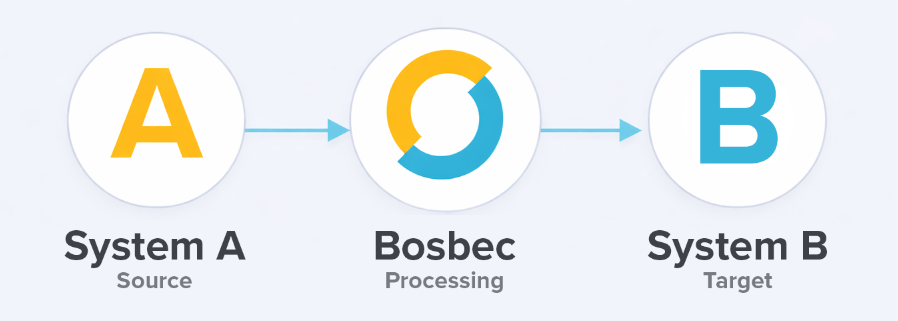 Data and events typically flow from System A into Bosbec, are processed in one or more steps using jobs, and are then sent on to System B. In some cases, data is also sent back to System A as part of the same process, for example, to update a status or store a reference ID.