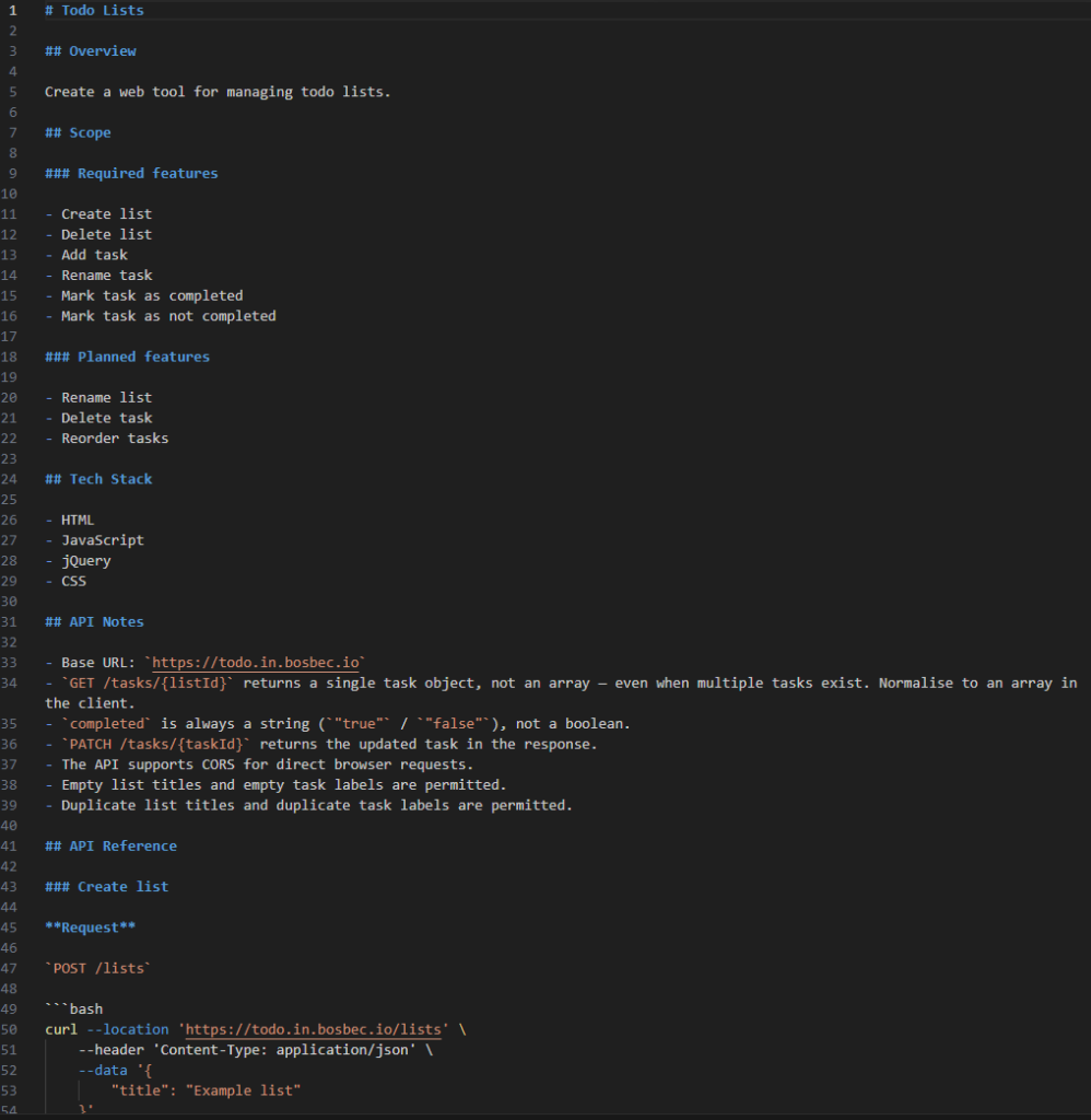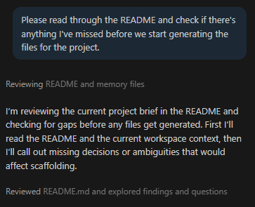 Open the README.md file and paste in the notes you wrote about the project when you first started outlining it. This document can be used as instructions for Copilot, but also as a reference for yourself, so you can document your ideas and more easily return to the project after a break.