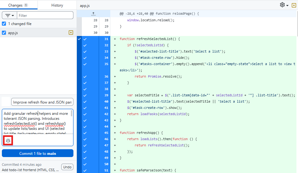 Speaking of changes, do not forget to create commits on GitHub so you have clear points to roll back to if needed. You can also use the Copilot button to generate commit messages, which makes it easier to understand what has been changed in each commit.