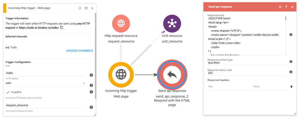 In the Send API Response job, we paste the combined HTML code, set the content type to text/html, and use a 302 redirect to the webpage.