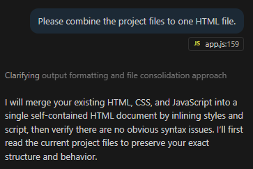 Another option is to ask Copilot to merge the project into a single-page file, which can then be returned directly from an HTTP response in a workflow. In the image below, you can see the prompt we used to ask Copilot to combine the project into a single file.